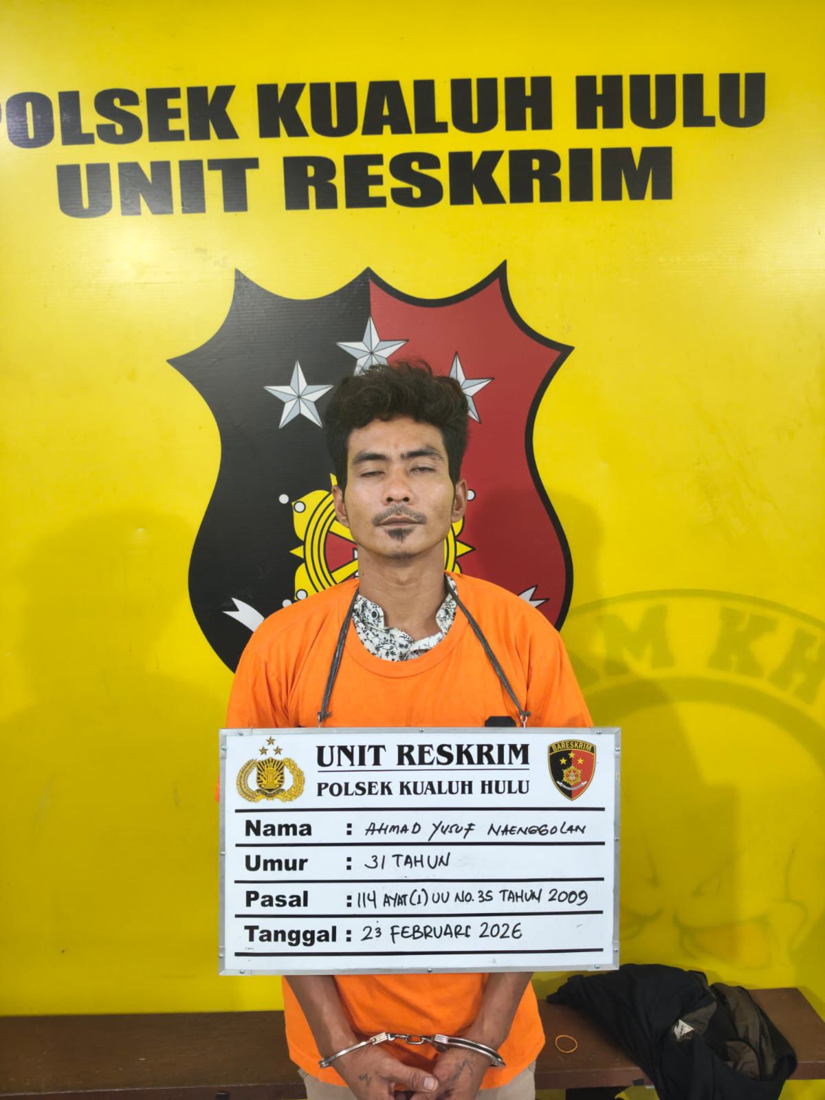 Nama tersangka Ahmad Yusup nainggolan, umur 31 tahun, agama islam, pekerjaan mahasiswa, alamat dusun perasaan Rejo Adian torop Aek natas, membawa 1 (satu) bungkus besar plastik klip transparan yang diduga berisikan narkotika jenis sabu-sabu dengan berat bruto 5,84 gram (lima koma delapan puluh empat gram bruto) dibawa kekantor Polsek kualuh hulu